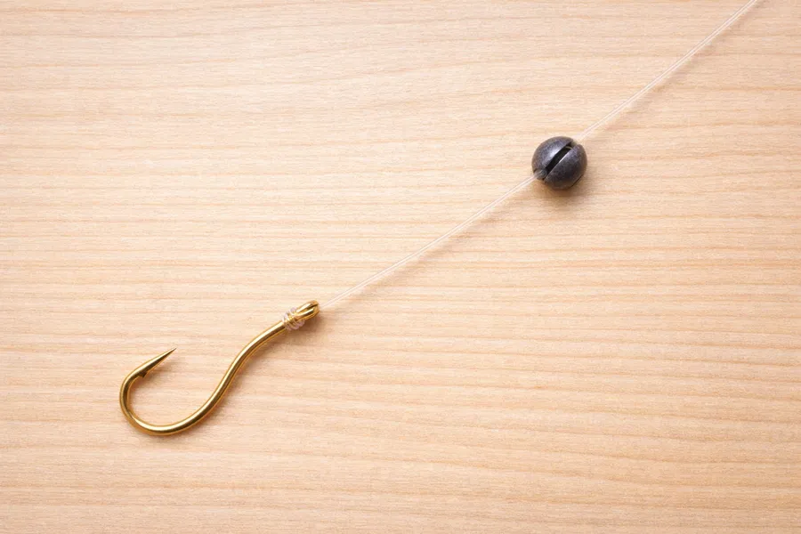 If you’re using a sliding sinker instead, thread it onto the line before tying the hook, then let it rest freely above the hook.
